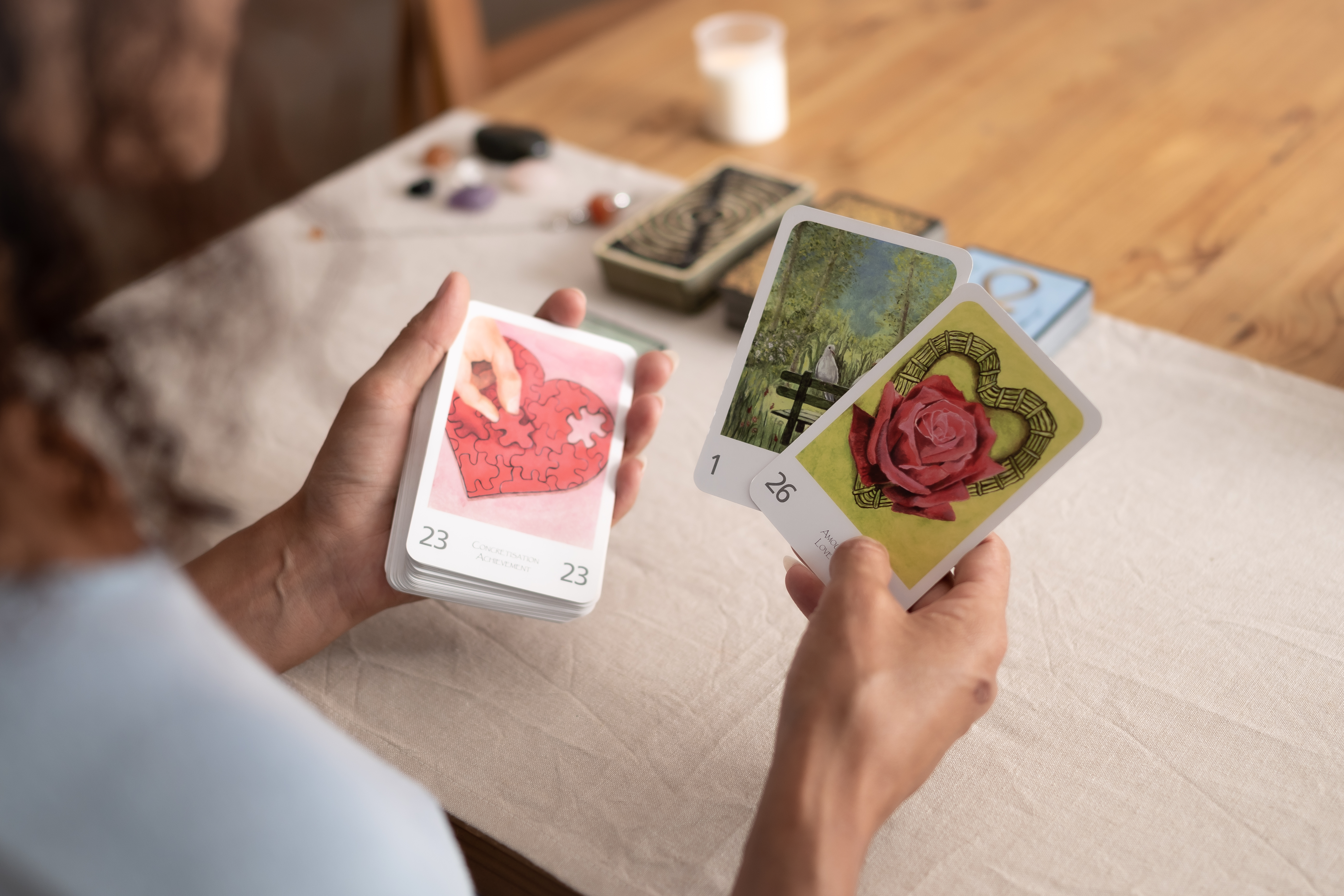 Au-delà de l’image de la fameuse « diseuse de bonne aventure » que l’on associe à la cartomancie, les cartes sont de merveilleux outils d’introspection et de prédiction qui me guident au quotidien dans ma pratique.